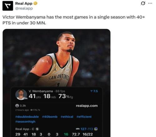 其中41分追平文班赛季单场得分新高,连续两场交出至少40+10也让其成为马刺队史首人。