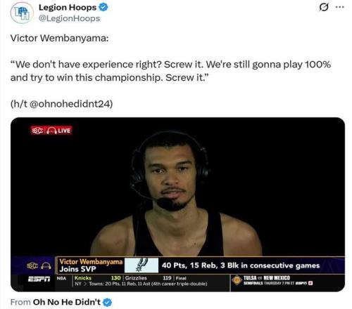 面对外界质疑球队缺少经验,文班说道:“去他的经验,我们相信彼此,能够按照状况调整出任何打球方式,所以我想说的是,我们会付出100%的努力去争夺冠军,去他的经验。”
