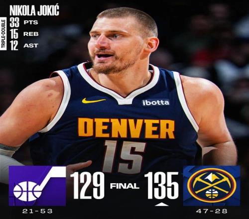 这场比赛,掘金当家球星约基奇又一次交出三双表现:全场出战38分钟,投篮16中13,三分2中2,罚球8中5,拿下33分15篮板12助攻。