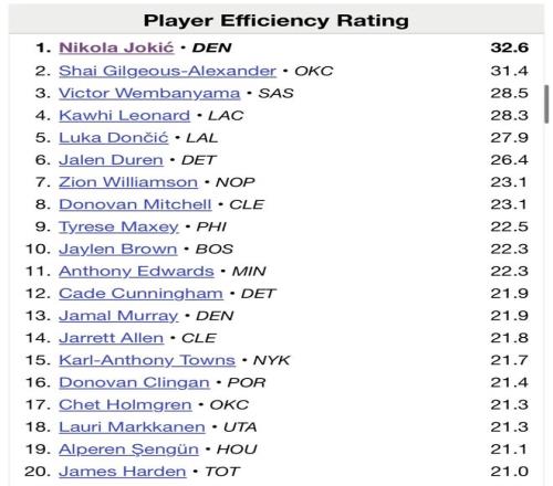 但就数据层面来说,约基奇依然是现役第一,一个最直接的数据就是PER值,这项(曾经)被认为是MVP风向标的高阶数据,约基奇达到了32.6。