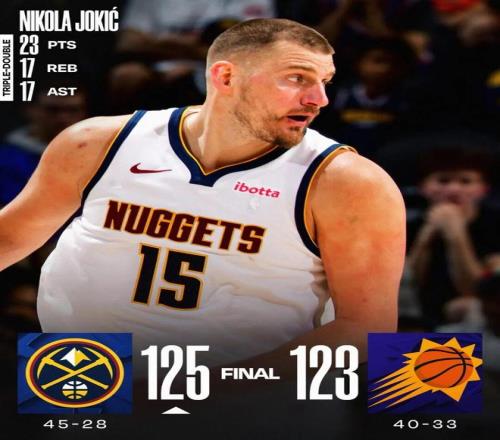 ——对阵太阳,约基奇16中9,得到23分17篮板17助攻,这是NBA历史上第12次单场17+17+17,罕见程度不输给单场70+