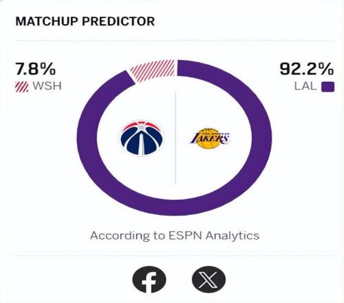 因为奇才过于羸弱,就算东契奇在这场比赛中缺席,湖人赢球的概率也高达92.2%。