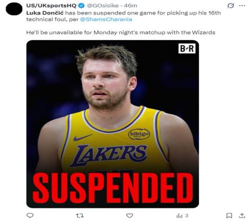 北京时间3月29日,NBA官方宣布,因为卢卡-东契奇累计16次技术犯规,他将自动禁赛一场,湖人下一场对阵奇才的比赛他无法出战。