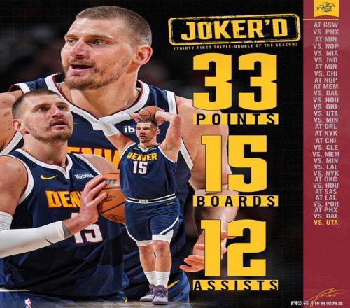 在近期紧密赛程中,四天之内他竟要出战三场比赛,且表现堪称卓越:与太阳队交锋时,他豪取23分、17篮板17次助攻;对阵独行侠,他再度砍下23分、21个篮板与19次助攻;面对爵士,更是火力全开,斩获33分、15个篮板和12次助攻。