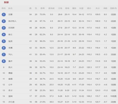 东部前十排名:活塞、凯尔特人、尼克斯、骑士、猛龙、老鹰、76人、魔术、热火、黄蜂。西部前十:雷霆、马刺、湖人、掘金、森林狼、火箭、太阳、快船、开拓者、勇士。加粗的是附加赛区,常规赛还剩8场左右,依然存在变数。
