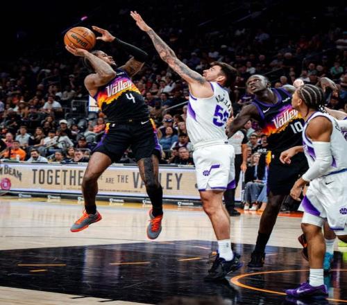 面对缺少了乔治、马尔卡宁、贾伦杰克逊和努尔基奇一众主力的爵士,太阳一上来就开启了碾压模式,双核布克和杰伦格林都展现出了超强的进攻欲望,作为战术核心和第一进攻发起点的布克,前两节就砍下了14分和4次助攻,杰伦格林更是半场飙下了20分,在二人的率领下,太阳也带着28分的巨大优势,回到了中场更衣室。