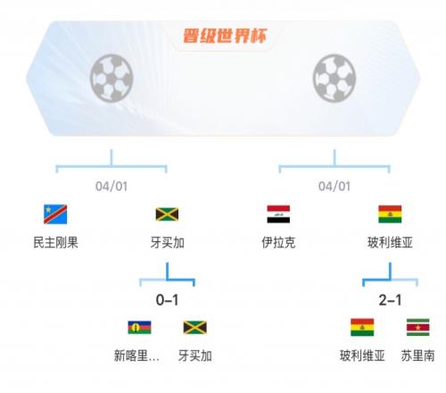此前在早些时候结束的另一场附加赛半决赛中, 玻利维亚2-1逆转苏里南,决赛将战伊拉克。