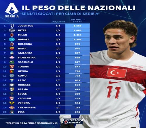 体育播报4月2日宣 德国转会市场统计了意甲各队球员在这个国际比赛日的出场总时间,并列出榜单,尤文、国米、米兰前三。