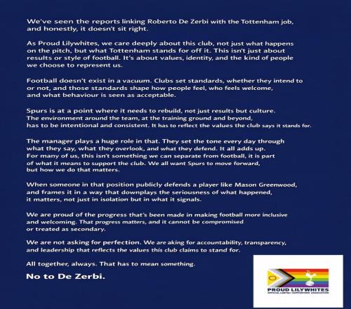 周五,热刺三大官方球迷组织同步发布声明:俱乐部LGBTQ +球迷协会“骄傲白鹿巷”、女性球迷协会“巷中佳人”,以及聚焦种族与多元文化的球迷协会“热刺同心”,共同敦促俱乐部坚守自身核心价值观。