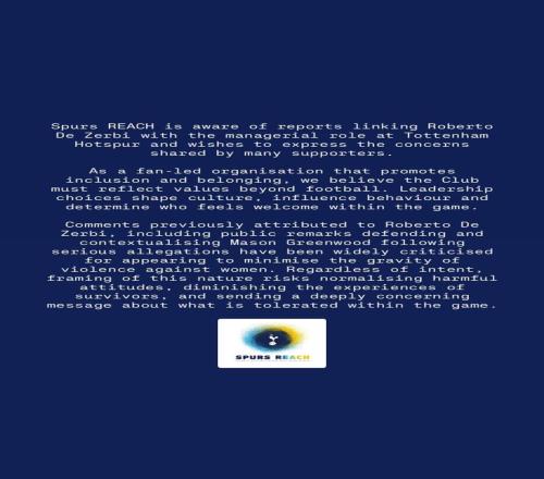 热刺同心(Spurs REACH)注意到了将罗伯托-德泽尔比与热刺主教练职位联系起来的报道,希望在此表达众多球迷共同的担忧。