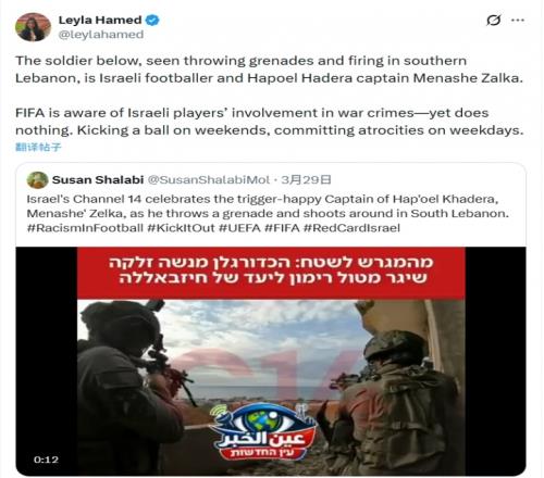 体育播报03月30日宣 记者Leyla Hamed近日在社媒转发了一个视频,炮轰了以色列球员参战的行为,并怒斥国际足联对此无动于衷。